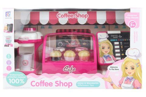 Velika kavarna z dodatki. Paket vključuje aparat za kavo, hladilnik s pecivom in blagajno. Kavni aparat se napaja z 2 baterijama AA (nista vključeni), hladilnik s 3 baterijami AG13 (vključene), blagajna pa z 2 baterijama AAA (vključeni). Dimenzije paketa približno 46 × 27 × 18 cm. Starost 3+