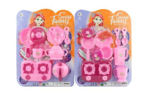 Sklop posode iz umetne mase. Vključuje kuhalnik in dodatke, kot so lonec, ponev ali krožniki. Pakirano na kartici. Dimenzije paketa 28×37,5×4,5 cm. Starost 3+