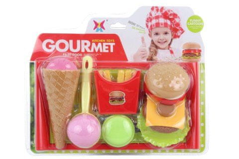 Plastični set za hrano vsebuje sladoled v kornetu, kepico za sladoled, zajemalko, makarone, krompirček, hamburger, ki ga je mogoče razdeliti na posamezne sestavine (žemlja, mesna kroglica, solata, sir, paradižnik, majoneza), in pladenj. Velikost paketa približno 29,5 × 25 × 7 cm. Starost 3+