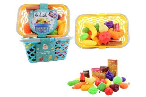Plastična nakupovalna košara s sadjem in zelenjavo. Paket vsebuje košarico in 25 kosov različnega sadja in zelenjave. Dimenzije paketa so 27×13×17 cm. Starost 3+