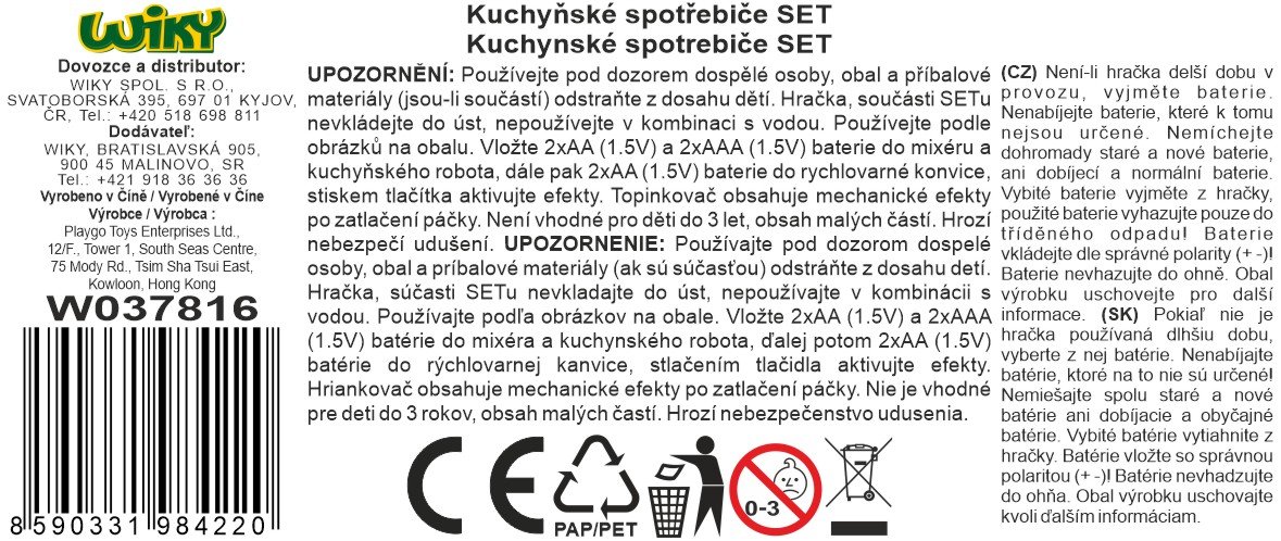 Playgo komplet kuhinjskih aparatov 4 kosi. Vključuje: kuhalnik, opekač kruha, mešalnik in kuhinjski robot. Toaster začne tiktakati, ko pritisnete ročico navzdol in nastavite številčnico, po izteku časa pa se iz njega izvali toast. Mešalnik meša, medtem ko držite gumb pritisnjen. Kuhinjski robot meša, ko držite gumb, in se ustavi, ko gumb izklopite. Kuhalnik oddaja zvok vrele vode. Baterije 2×AAA (kuhinjski robot), 2×AA (mešalnik) in 2×AA (kuhalnik). Baterije niso priložene.