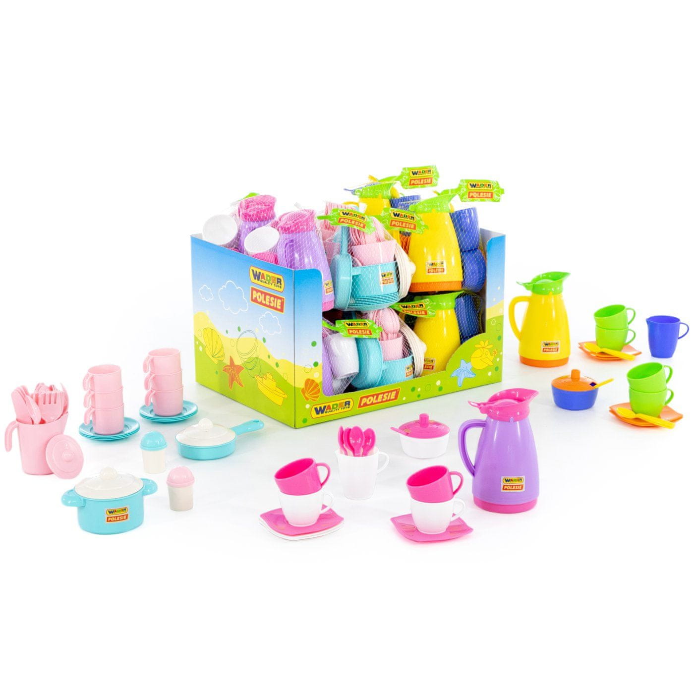 Rožno-beli set z vijoličnim čajnikom: čajnik, 4 skodelice, 4 krožniki, 4 žlice, sladkorna posoda, vrč za mleko Barvni komplet s čajnikom: čajnik, 4 skodelice, 4 krožniki, 4 žlice, sladkorna posoda, vrč za mleko Barvni komplet brez čajnika: 6 skodelic, 6 krožnikov, 6 žlic, 6 vilic in nožev, solnica in poprovka, lonec s pokrovom, ponev Priporočena starost: o