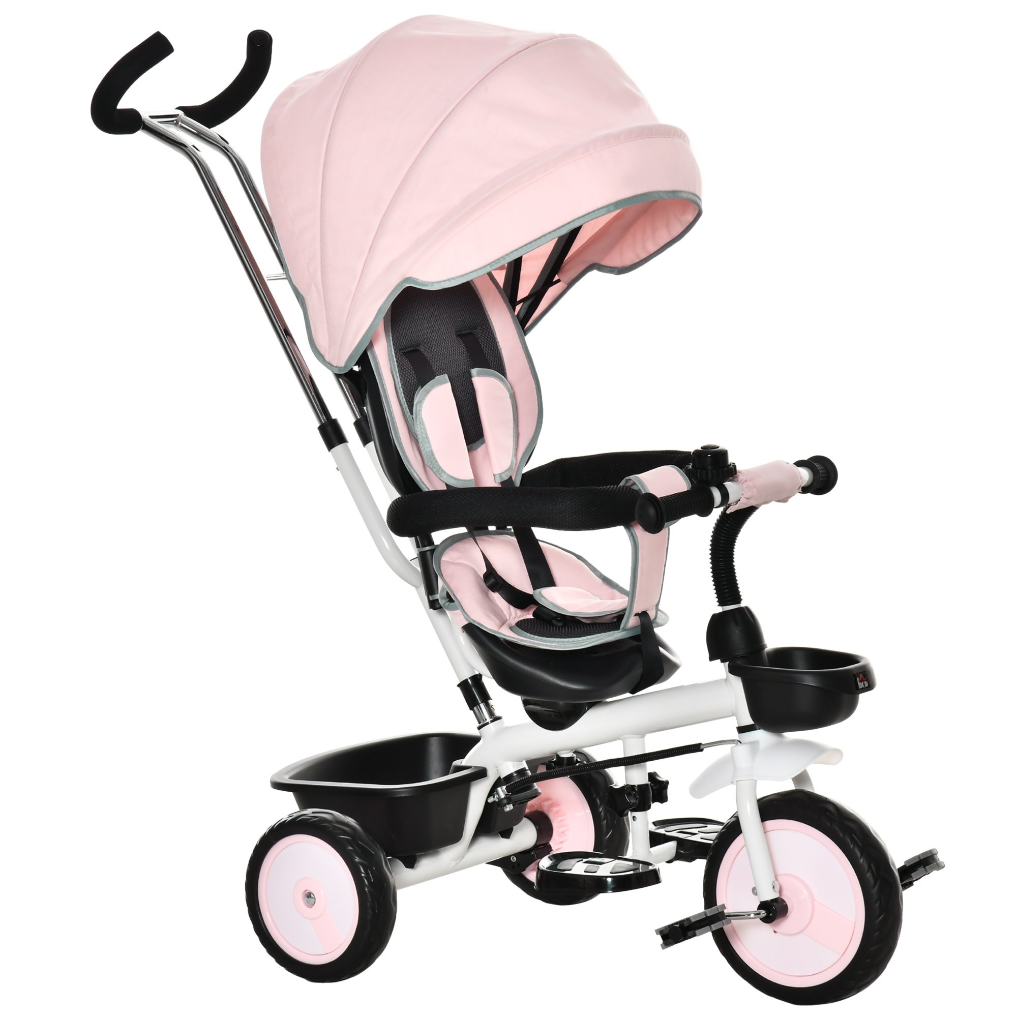 HOMCOM Obojestranski otroški tricikel z ročajem, nadstreškom in odstranljivim zložljivim naslonom za noge, starost 1-5 let, roza