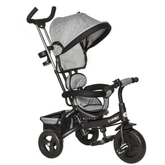 Barva: siva, črnaMaterial: kovina, plastika, tkaninaCelotne mere: 92D x 51Š x 110V cm Velikost sedeža: 25Š x 33V cm Velikost krošnje: 46D x 36Š cm Velikost ročaja: 81.5cm, 76cm Velikost košare: 30D x 25Š x 14V cm Nosilnost: 25kg Neto teža: 7.7 kg Certifikat: EN71–1–2–3 Priporočena starost: 18+ mesecev