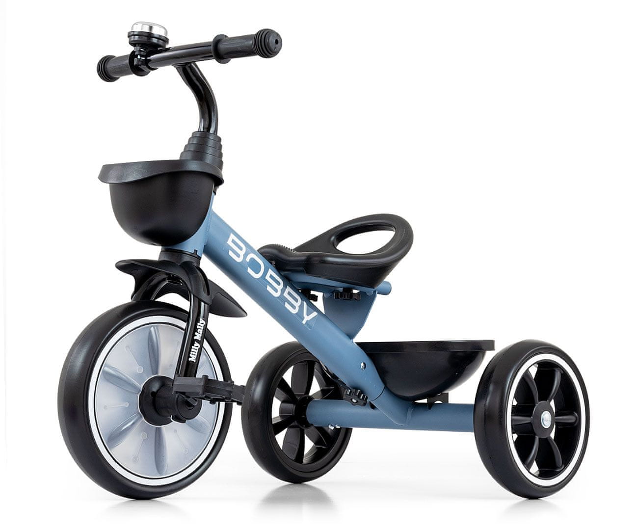 Tricikel BOBBY je bil ustvarjen z mislijo na udobje in varnost najmlajših ter udobje staršev. Je idealna rešitev za aktivne otroke, ki se naveličajo vožnje v otroškem vozičku. Bobby je stabilno in varno kolo za vašega otroka, z brezčasnim dizajnom in udobnim oblikovanim sedežem. Sprednje kolo je zaščiteno pred zatikanjem otrokovih nog, ko naš mladi kolesar pritisne na pedale. Krmilo kolesa se lahko sname s pomočjo gumba, ki se nahaja na sprednji strani.