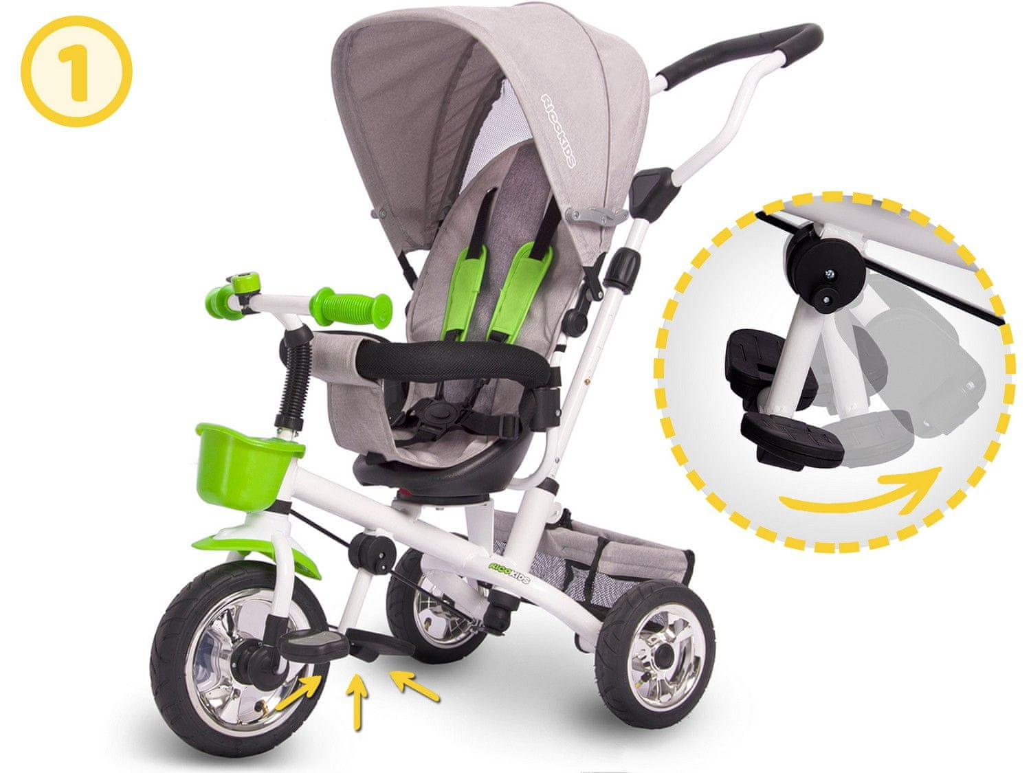 VOZIČEK, OBRNJEN V SMER VOŽNJE: Malček opazuje svet, medtem ko noge počivajo na zložljivih oporah. Vključena je funkcija „prostega teka“ – sprednje kolo se vrti brez poganjanja pedal.