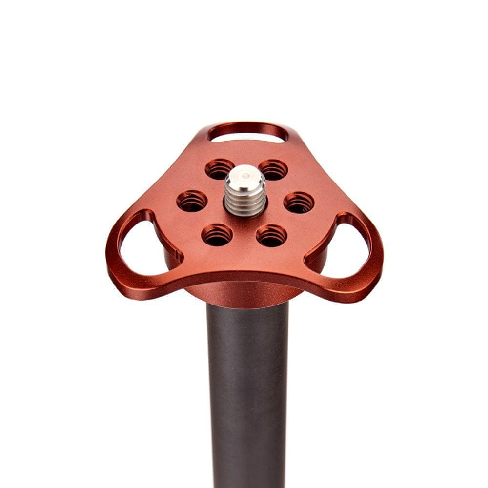 Oblikovana plošča Tri-Mount vključuje 3 votle ostroge za pritrditev traku, karabina ali 3LT Toolz, 6 1/4″ navojnih lukenj za najrazličnejše CSC/DSLR fotoaparate in videokamere ter 1 3/8″ navojno luknjo za namestitev mikrofona, pa tudi vetrovni rokav. Toga in popolnoma uravnotežena konstrukcija iz 8 plasti ogljikovih vlaken in magnezijeve zlitine letalske in vesoljske kakovosti bo zagotovila stabilnost stativa v vseh razmerah. Zaradi uporabljenih materialov ima stativ impresivno razmerje med obremenitvijo in težo 24 : 1, saj ima neverjetnih 30 kg nosilnosti z nameščeno glavo, zaradi česar je primeren za bistveno težje fotoaparate DSLR.