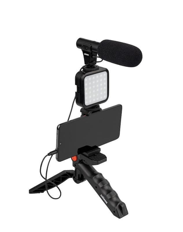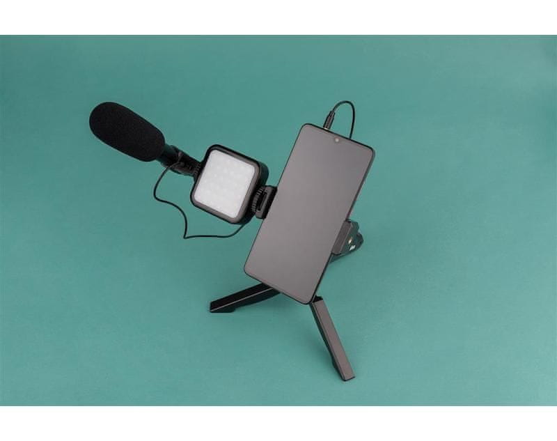 Kompaktna video luč s smernim mono mikrofonom, nastavkom za mobilni telefon in namiznim stativom za video bloge. Celoten opis