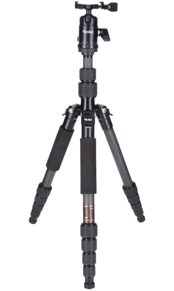 Rolleijev lahki karbonski stativ ima glavo s ploščico za hitro sproščanje. Podnožje stativa ima gumijaste noge, gumijaste konce nog pa lahko odstranite in ga za boljšo stabilnost zapičite v tla. Noge stativa so raztegljive, v zloženem stanju so dolge 34 cm, v razvitem pa 142 cm. Skupna teža je 980 g, stativ pa lahko prenese do 8 kg! Vsak fotograf bo cenil ta kompakten in robusten stativ. Uporabljate ga lahko tudi kot monopod.