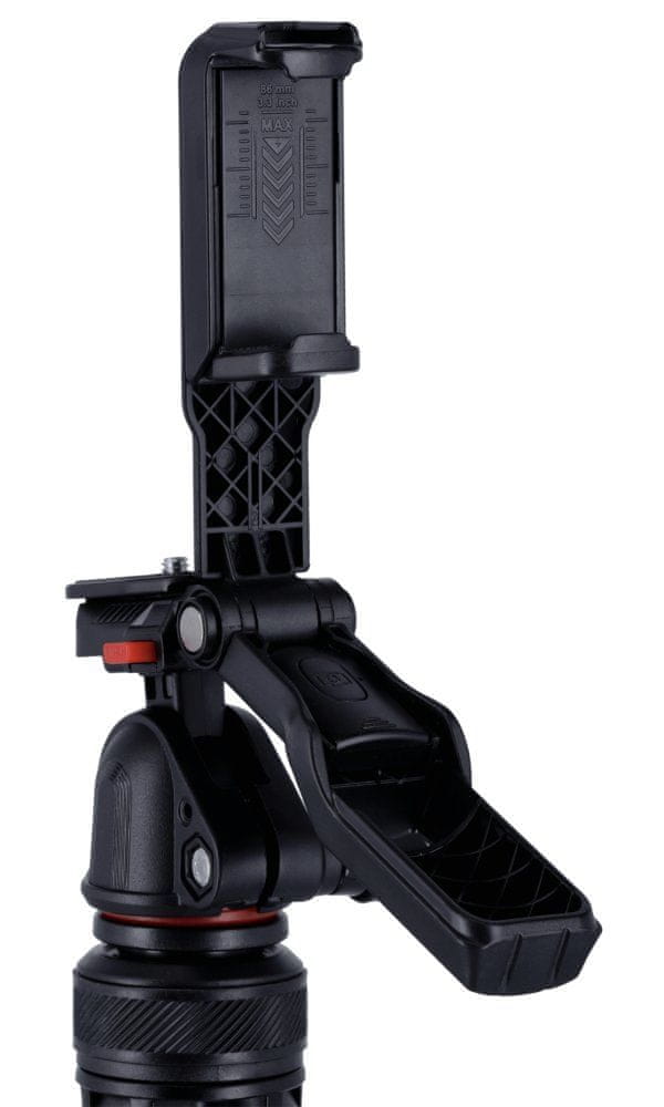 - Stabilna zasnova z nosilnostjo 2,5 kg za varno namestitev fotoaparatov in pametnih telefonov.