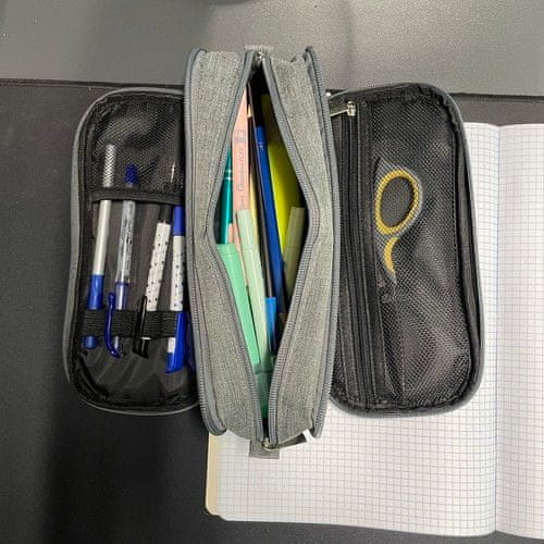 Velik sivi šolski etui z razširitvijo in tremi predelnimi prostori je idealna rešitev za organizacijo šolskih potrebščin in pisarniškega materiala. Z njegovo funkcionalnostjo lahko enostavno uredite svinčnike, pisala, barvice in druge drobne predmete v posameznih predelninah, ki so opremljene z zadrgami za hiter dostop. Prva predelnica vsebuje dva blazinska in eno mrežasto žep za zadrgo, srednja, najbolj prostorna, je idealna za celoten komplet barvic, tretja pa ponuja fleksibilnost s 5 držali za pisalne potrebščine in dodatno zaščito za manjše predmete.