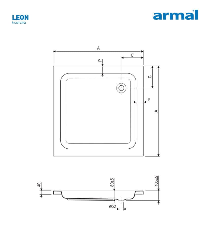 Armal Tuš kad za prhanje LEON 80 x 80 x 21 kvadratna, z oblogo, brez sifona