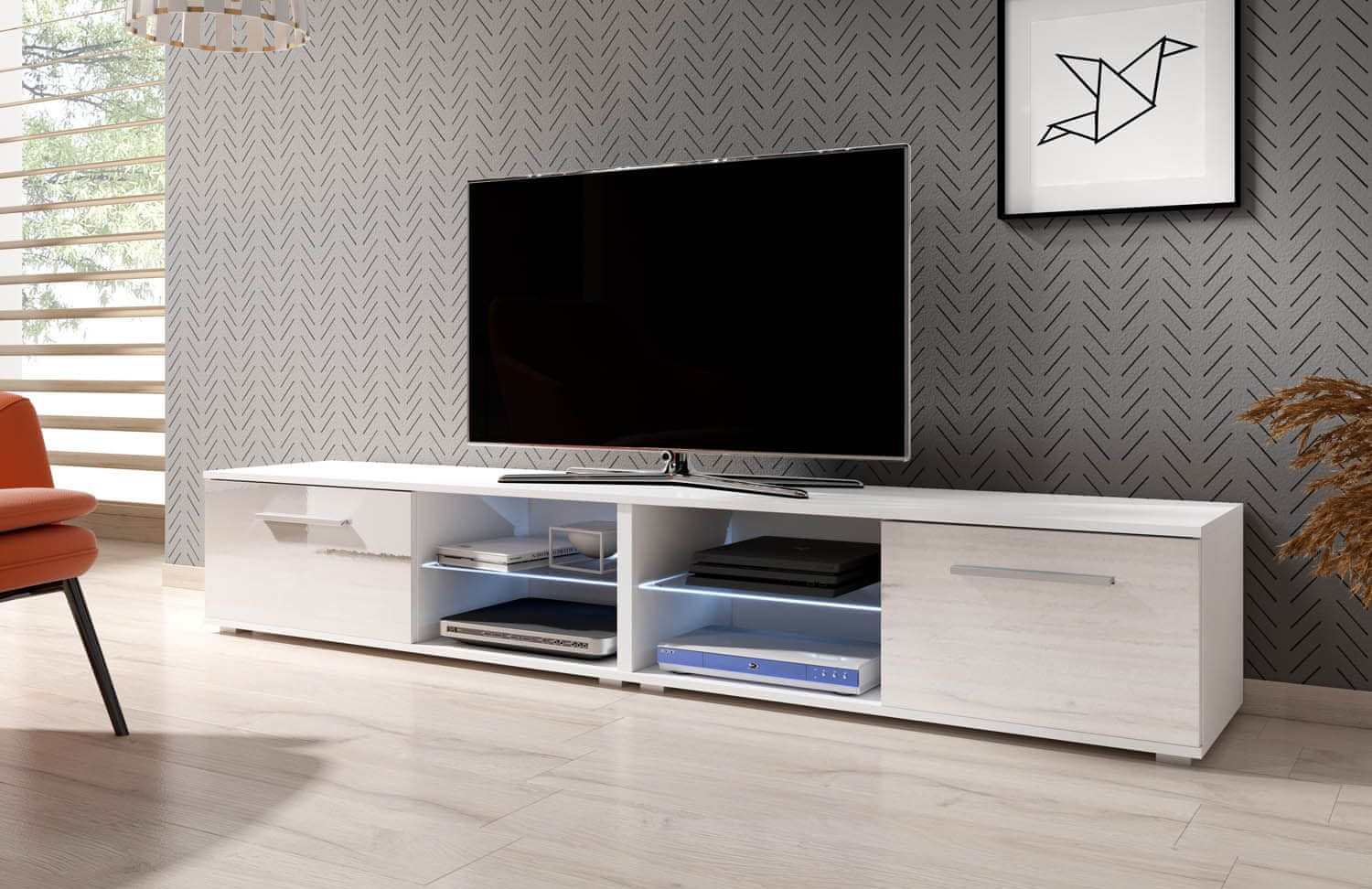 Furnitura TV omarica ELARA 2 bela visoki sijaj 200 cm + LED
