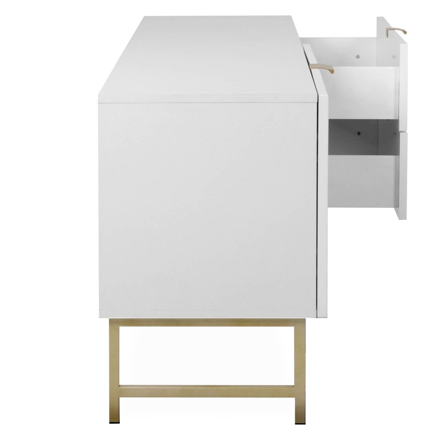 Bela TV omarica, elegantna in funkcionalna dopolnitev vsake dnevne sobe, z modernim dizajnom in značilno 3D valovito strukturo na sprednjih panelih, ta medijska enota nudi obilo prostora za vaš televizor in dekorativne predmete, medtem ko več predalov in predelkov zagotavlja veliko prostora za shranjevanje vsakodnevnih potrebščin, njena robustna konstrukcija in elegantni zlati poudarki jo naredita praktično in vizualno privlačno izbiro za vaš dom.