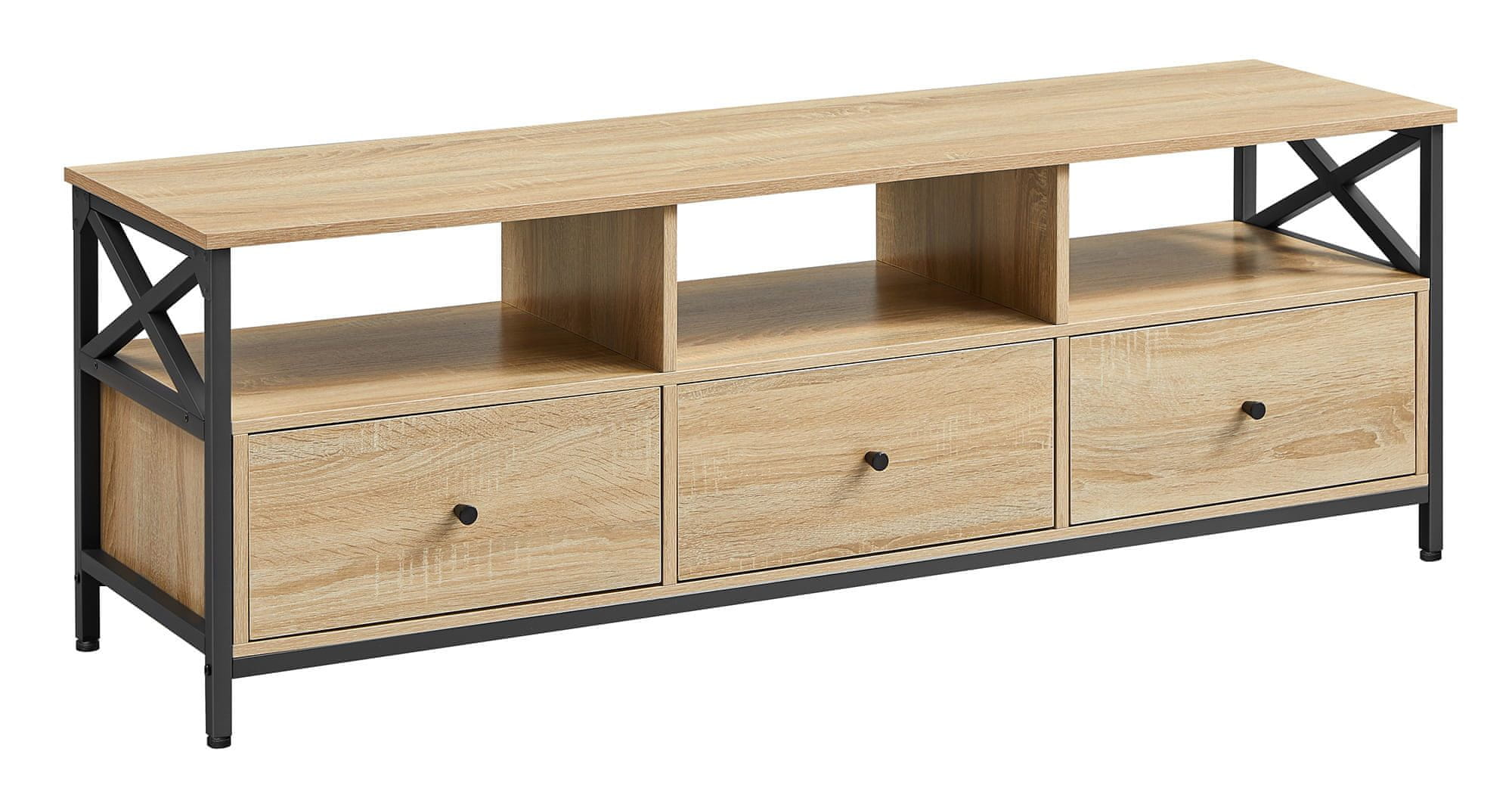 Elegantna in praktična TV omarica združuje modern dizajn z visoko funkcionalnostjo. Zahvaljujoč trdni kovinski konstrukciji in uporabi kakovostnih materialov, kot je iverna plošča v dekorju hrasta sonoma, zagotavlja dolgo življenjsko dobo in odpornost. Tri odprte police zagotavljajo dovolj prostora za shranjevanje elektronike, medtem ko predali skrijejo vse, kar ne želite imeti na očeh. Višinsko nastavljive nogice omogočajo stabilno postavitev tudi na neravni površini, in omarica je idealna za televizorje z diagonalo do 65". Ta omarica je ne samo funkcionalna rešitev za vašo dnevno sobo, ampak tudi okusni dodatek, ki označuje stil vašega interierja.