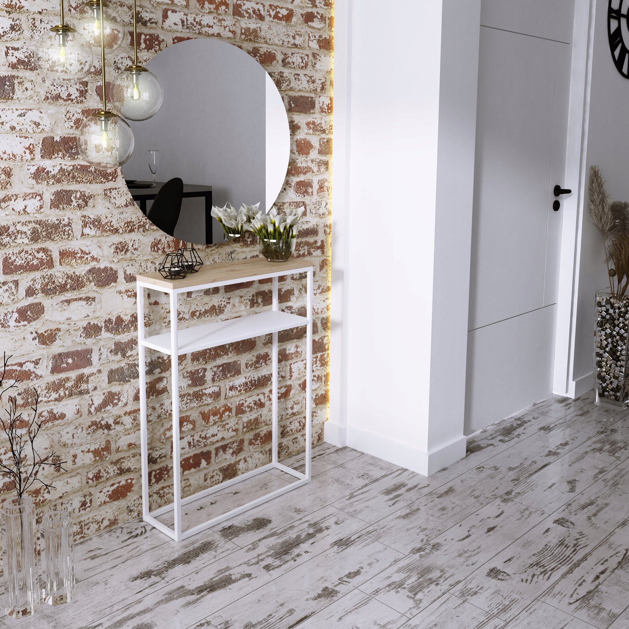 Edinstvena, praktična, elegantna in hkrati preprosta konzolna mizica za hodnik. Kombinacija kovine z najkakovostnejšo ploščo. Masiven, pravokoten zgornji del, debeline 1,8 cm, je videti zelo estetsko privlačen. Profilirane kovinske noge. Prašno barvano. Popolnoma se bo podal v vaš hodnik ali celo dnevno sobo.