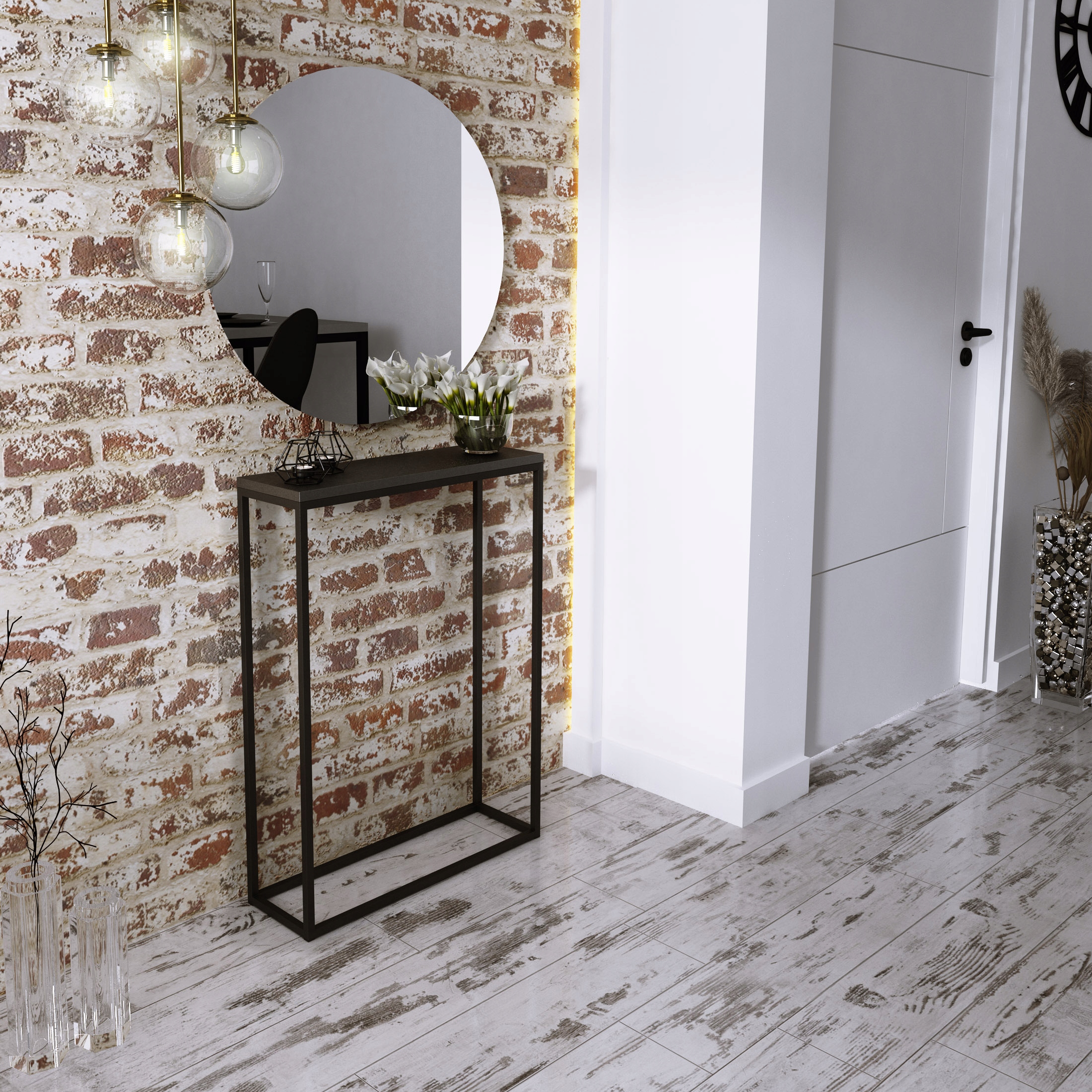 Edinstvena, praktična, elegantna in hkrati preprosta konzolna mizica za hodnik. Kombinacija kovine z zgornjim delom najvišje kakovosti. Masiven, pravokoten zgornji del, debeline 1,8 cm, je videti zelo estetsko privlačen. Profilirane kovinske noge. Prašno barvano. Popolnoma se bo podal v vaš hodnik ali celo dnevno sobo.