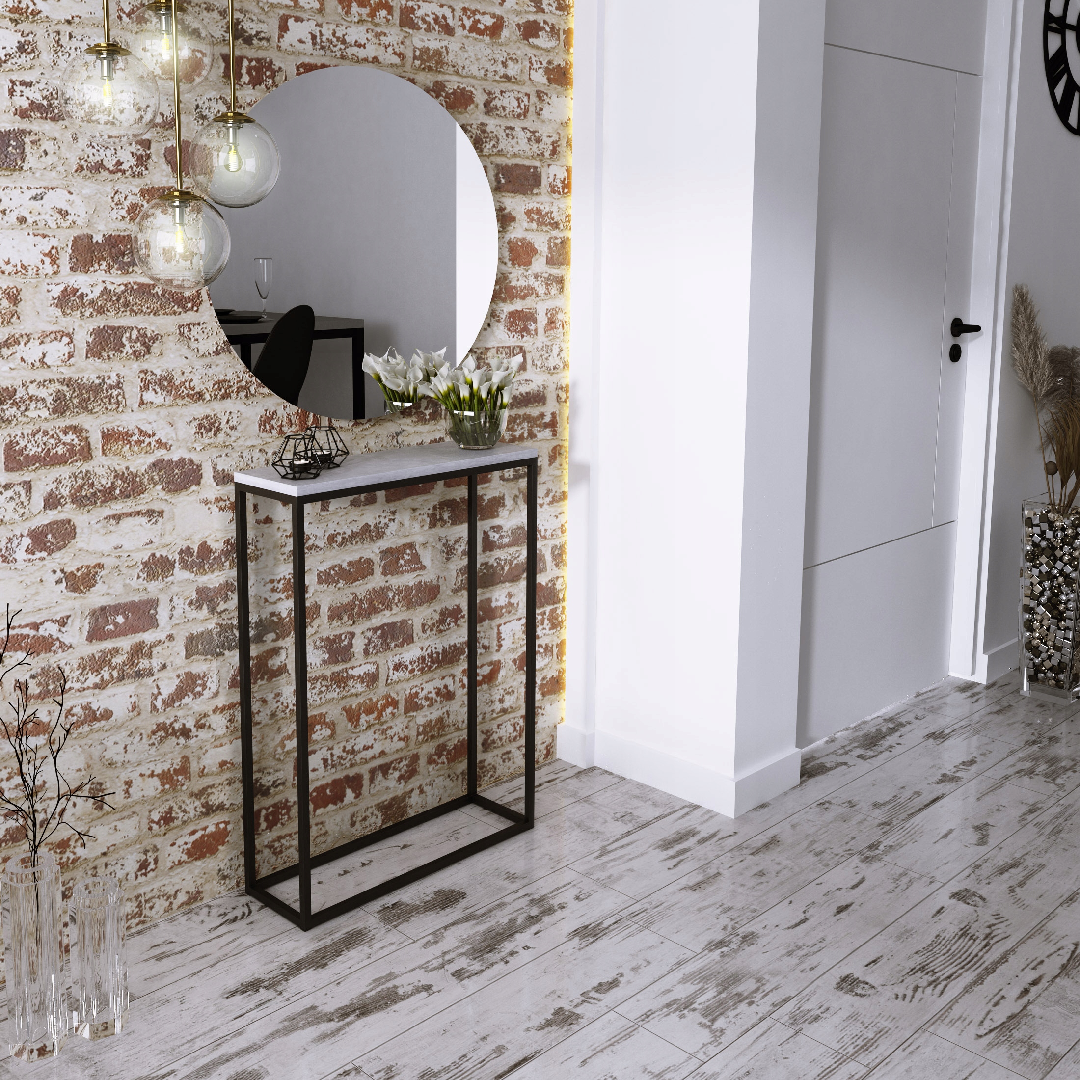 Edinstvena, praktična, elegantna in hkrati preprosta konzolna mizica za hodnik. Kombinacija kovine z vrhom najvišje kakovosti. Masiven, pravokoten zgornji del, debeline 1,8 cm, je videti zelo estetsko privlačen. Profilirane kovinske noge. Prašno barvano. Popolnoma se bo podal v vaš hodnik ali celo dnevno sobo.