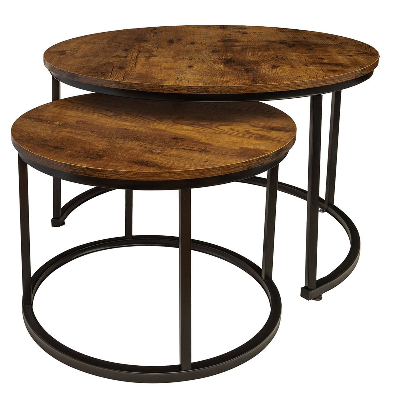 Ta moderni komplet dveh okroglih klubskih mizic je praktična in elegantna rešitev za vašo dnevno sobo, delovno sobo ali salon. Rustikalne lesene (MDF) plošče se lepo dopolnjujejo s črnimi kovinskimi nogami, kar celotni stvari daje industrijski, podstrešni značaj.