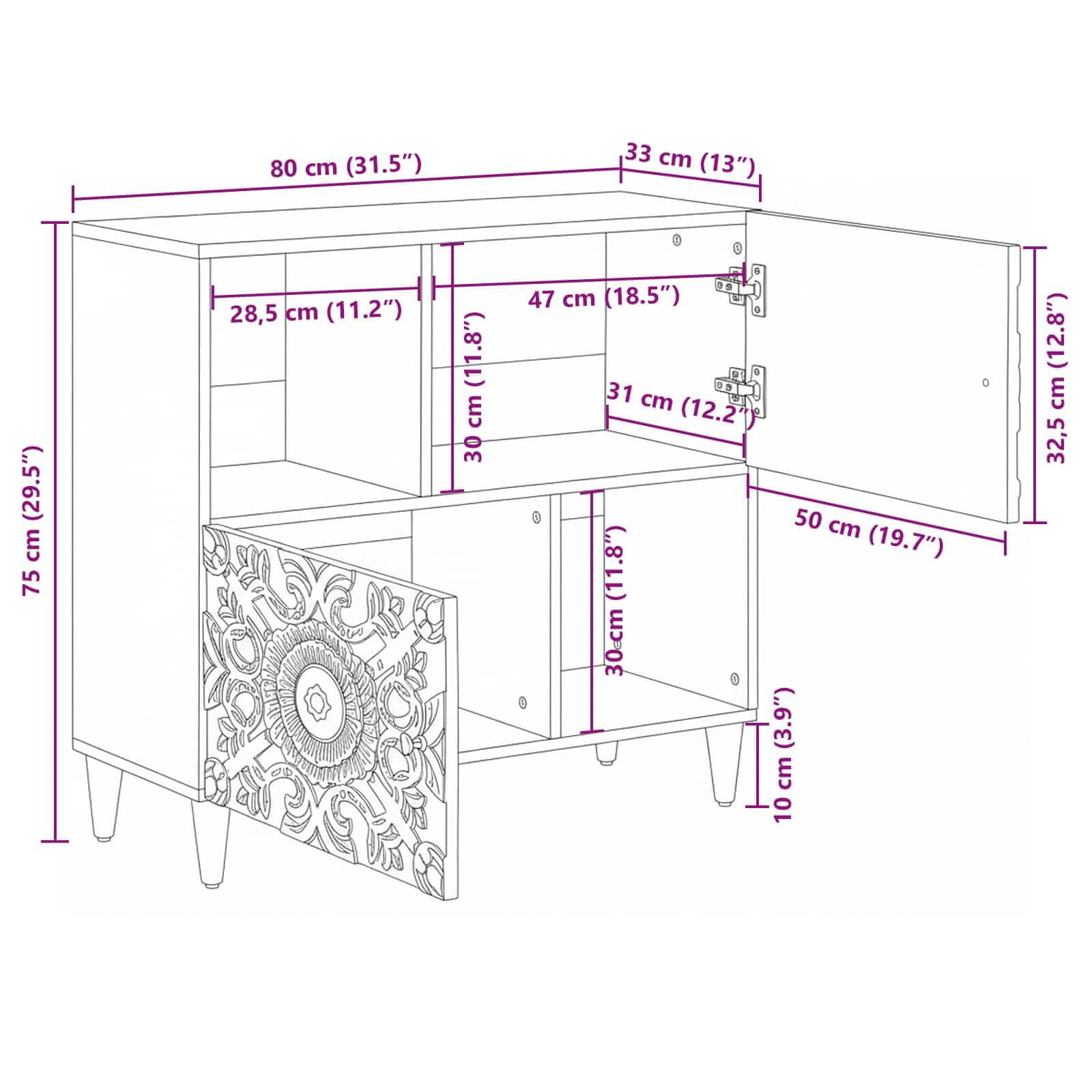 • Materiali: Ta sideboard je narejen iz trdnega in dolgotrajnega lesa, kar ponuja odlično mešanico sloga in funkcionalnosti. Kakovostni materiali zagotavljajo dolgoživost in enostavno vzdrževanje.