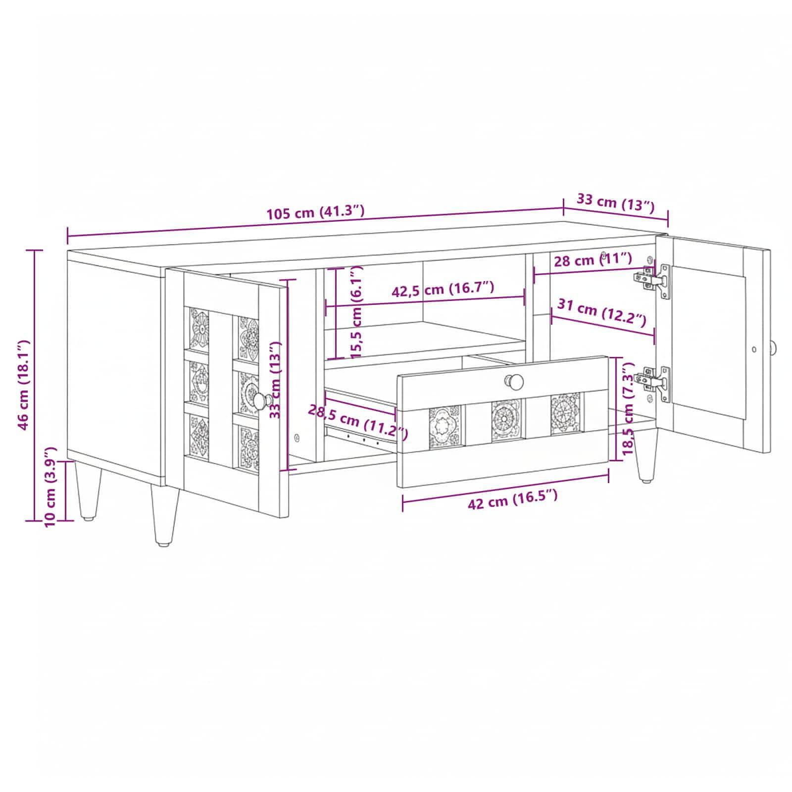 • Obsežno shranjevanje: S pomočjo več predelkov, vrati in gladko delujočimi predali, ta omarica ponuja dovolj prostora za organizacijo in shranjevanje elektronike in medijskih dodatkov. Gumbi na predalih in vratih dodajo eleganten pridih.