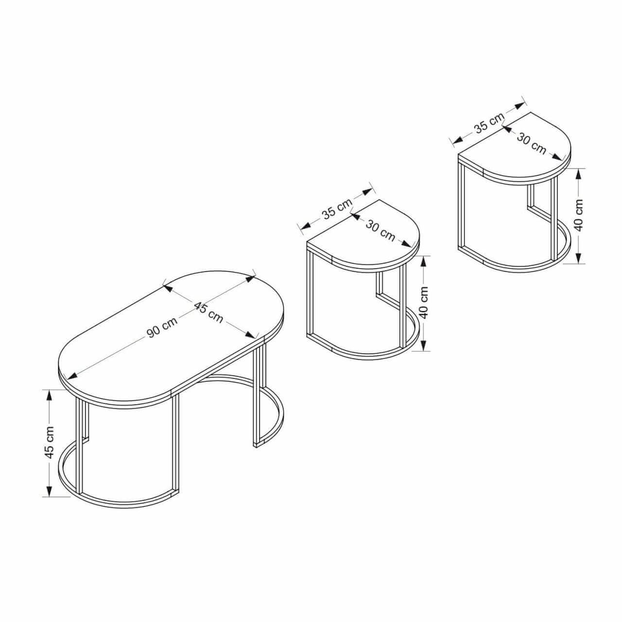 100 % MELAMINSKO PREVLEČENA IVERNA PLOŠČA Debelina: 18 mm Kovinski okvir Velikost: Širina: 90 cm Višina: 45 cm Globina: 45 cm (1 kos) Velikost: Širina: 35 cm Višina: 40 cm Globina: 30 cm (2 kosa)