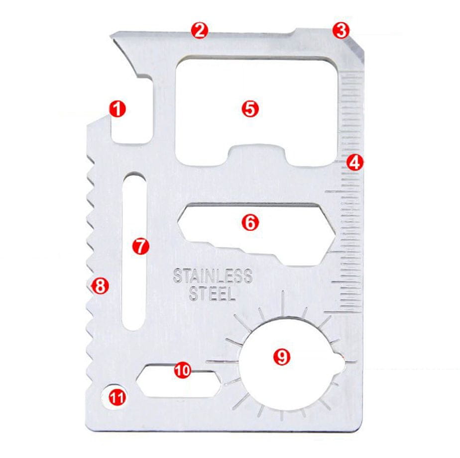 Večnamenska preživetvena kartica 16-v-1 z etuijem je izjemno vsestransko večnamensko orodje, ki zaradi svoje kompaktne velikosti zlahka najde prostor v vaši denarnici ali žepu. Izdelana iz vzdržljivega nerjavečega jekla, je idealna izbira za vse, ki cenijo praktičnost in funkcionalnost v vseh pogojih. Večnamenska preživetvena kartica vključuje naslednje funkcije in orodja: – Odpirač konzerv: Ključen pripomoček za vsako avanturo, ki omogoča enostavno odpiranje konzerv: Ploščat izvijač: Ostra in vzdržljiva rezila za rezanje različnih materialov – Ploščat izvijač: Uporaben za manjša popravila na terenu. – Merilnik: Nenadomestljiv za hitre meritve, koristen v številnih situacijah. – Odpirač steklenic: Idealno za kampiranje ali piknike, omogoča enostavno odpiranje steklenic. – Obročni ključ 4 mm, 5 mm: Precizni ključi za manjše vijake in matice. – Metuljček: Odličen za metuljaste vijake, povečuje funkcionalnost orodja. – Žaga: Majhna, a učinkovita žaga za rezanje majhnih vej ali plastike. – Kazalec zemljevida: Pomaga pri navigaciji na terenu. – Oko za vrvico ali obroč za ključe: Večnamenska kartica ni le orodje, ampak tudi zagotovilo varnosti in udobja v vseh pogojih. Njena kompaktna velikost in večfunkcionalnost jo naredijo nepogrešljivega spremljevalca na vsakem potovanju, izletu ali vsakdanji rabi. Izdelana iz visokokakovostnega nerjavečega jekla, je odporna proti koroziji in mehanskim poškodbam. Najpogostejša vprašanja: Ali je kartica varna za uporabo? Da, kartica je zasnovana z mislijo na varnost uporabnika. Vsi roboti so skrbno obdelani, orodja, kot je nož, pa so razporejena tako, da zmanjšujejo tveganje za poškodbe. Ali kartica ustreza standardnim denarnicam? Da, kartica UltiTool ima dimenzije 8 cm x 5,5 cm x 0,5 cm, kar pomeni, da se popolnoma prilega v standardni predal za kartice v denarnici. Ali je nerjaveče jeklo odporno proti koroziji? Da, nerjaveče jeklo, iz katerega je kartica izdelana, je zelo odporno proti koroziji, kar zagotavlja njegovo dolgo življenjsko dobo tudi v težkih pogojih.