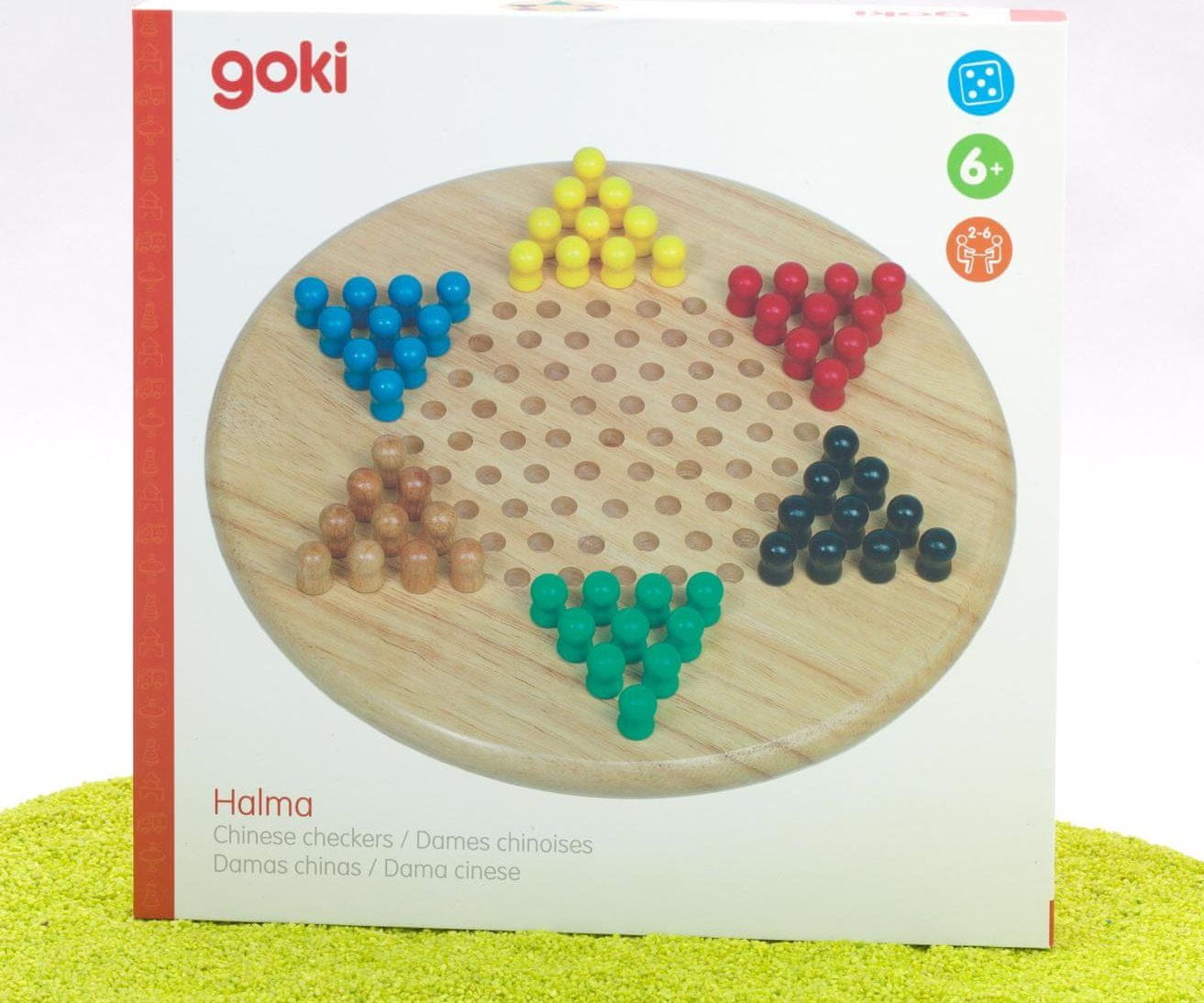 Halma (kitajska dama) je igra za najmanj dva igralca, vsak ima 10 ploščic, njun cilj pa je čim hitreje spraviti vse svoje ploščice v nasprotni kot. Igra vsebuje: igralno ploščo Ø 29 cm, 60 kamnov v šestih barvah, navodila. GOKI je eden najpomembnejših evropskih proizvajalcev igrač visoke pedagoške in didaktične kakovosti. Podjetje poudarja varnost igrač, njihovo zdravstveno neoporečnost in skrb za obnovljive vire. Les se pridobiva tam, kjer lahko raste. Uporabljajo se naslednje vrste lesa: javor, bukev, oreh, lipa, jesen, bor, breza in kavčukovec. Barve in laki so nabavljeni pri manjših proizvajalcih.