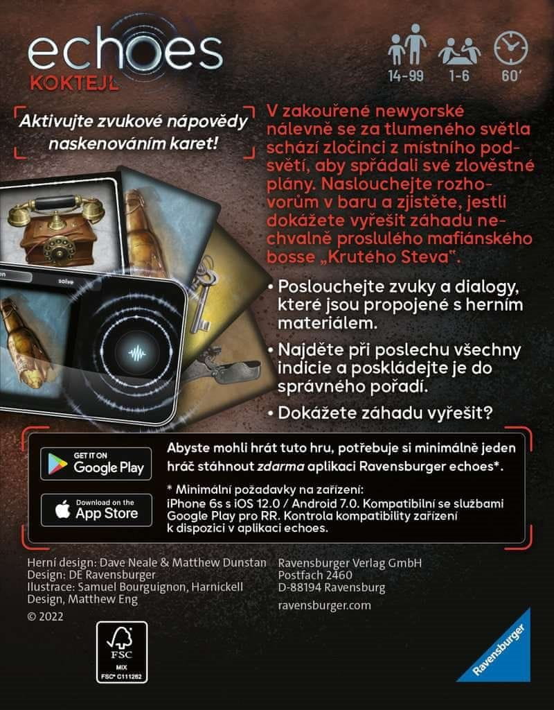 V zadimljenem newyorškem speakeasyju se v šibki svetlobi zbirajo kriminalci iz lokalnega podzemlja in kujejo svoje zlovešče načrte. Prisluhnite pogovorom v baru in preverite, ali lahko razrešite skrivnost zloglasnega mafijskega šefa „Cruel Steve“. Odmevi so razburljiva detektivska igra za vso družino in skupino prijateljev. Kako dobro znate prisluhniti zvokom v svojem okolju? V igri Odmevi preiskujete skrivnosti z uporabo svojih posebnih spretnosti. Med preiskovanjem predmetov boste slišali odmeve iz preteklosti – skrivnostne zvoke in glasove, ki vam omogočajo, da odkrijete skrivno zgodovino predmetov in postavite dogodke v pravo zaporedje. Zvočne namige aktivirajte s skeniranjem kartic. Prisluhnite zvokom in dialogom, ki so povezani z igralnim gradivom. Med poslušanjem poiščite vse namige, jih postavite v pravilen vrstni red in rešite skrivnost. Za igranje igre morate prenesti brezplačno aplikacijo Ravensburgerjevi odmevi, ki jo v celoti v češčini pripoveduje Václav Neužil.