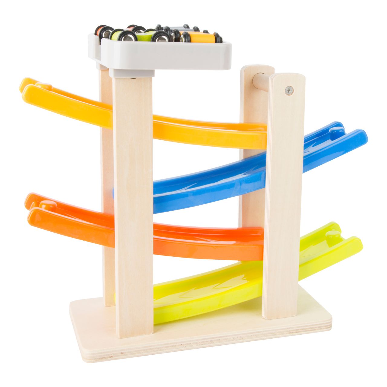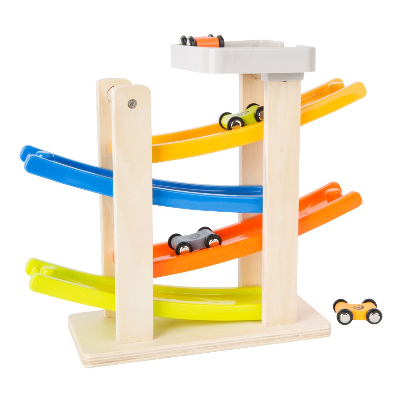 In zdaj se dirka zares začenja! Ti leseni dirkalniki se spuščajo po štirih rampah in izvajajo osupljive salte. Lesena dirkalna steza ima stabilno podlago in je dobro opremljena za otroško sobo. Pripravite se, postavite, pojdite! Glavne značilnosti: sodoben barvit dizajnrazvija motorične sposobnosti na igriv način