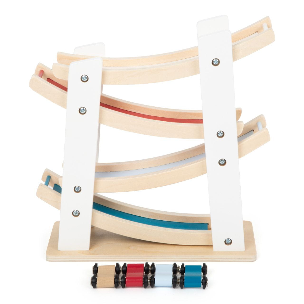 Pripravite se, pripravite se in pojdite! Ta lesena kaskadna dirkalna steza ponuja prostor za merjenje hitrosti 4 avtomobilov. Z ene ravni na drugo avtomobili delajo salte in že samo opazovanje je zabavno. Proga je izdelana iz naravnega in belega lesa, en avtomobilček je naraven, preostali 3 so barvni. Igrača razvija otrokove motorične spretnosti, prav tako koordinacijo roka-oko. Glavne značilnosti Naravni les s pisanimi podrobnostmiObojestranski avtomobili z gumiranimi kolesiRazvija motorične spretnosti in koordinacijo roka-oko