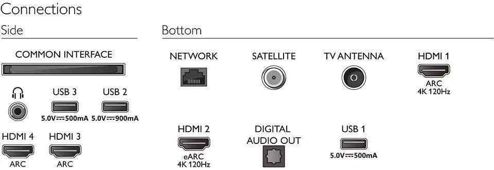 | Povezljivost | 4× HDMI 2× USB Ethernet-LAN RJ-45 Wi-Fi 802.11ac, 2 × 2, dvopasovni Bluetooth 5.0 Digitalni avdio izhod (optični) Storitveni priključek Satelitski priključek CI+ reža Izhod za slušalke Igranje iger: ALLM, HDMI VRR, AMD FreeSync Premium |