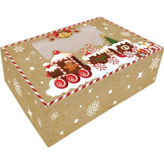 Zložljiva škatla za božične sladkarije ali priboljške s prozornim okencem – motiv božičnega vlaka. Dimenzije 36×22×5 cm.