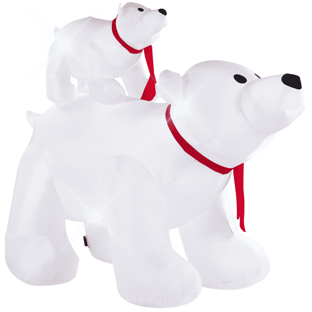 Uživajte na svojem dvorišču z najbolj čudovitim napihljivim okraskom, ki mu bo dal še bolj prazničen videz. Ta čudovita dekoracija s polarnim medvedom in mladičem na njegovem hrbtu bo zagotovo izboljšala razpoloženje vseh. Napihne se sam in je opremljen z lučkami LED, zaradi katerih je v temi videti čarobno. Priložen montažni komplet zagotavlja, da ostane na svojem mestu.