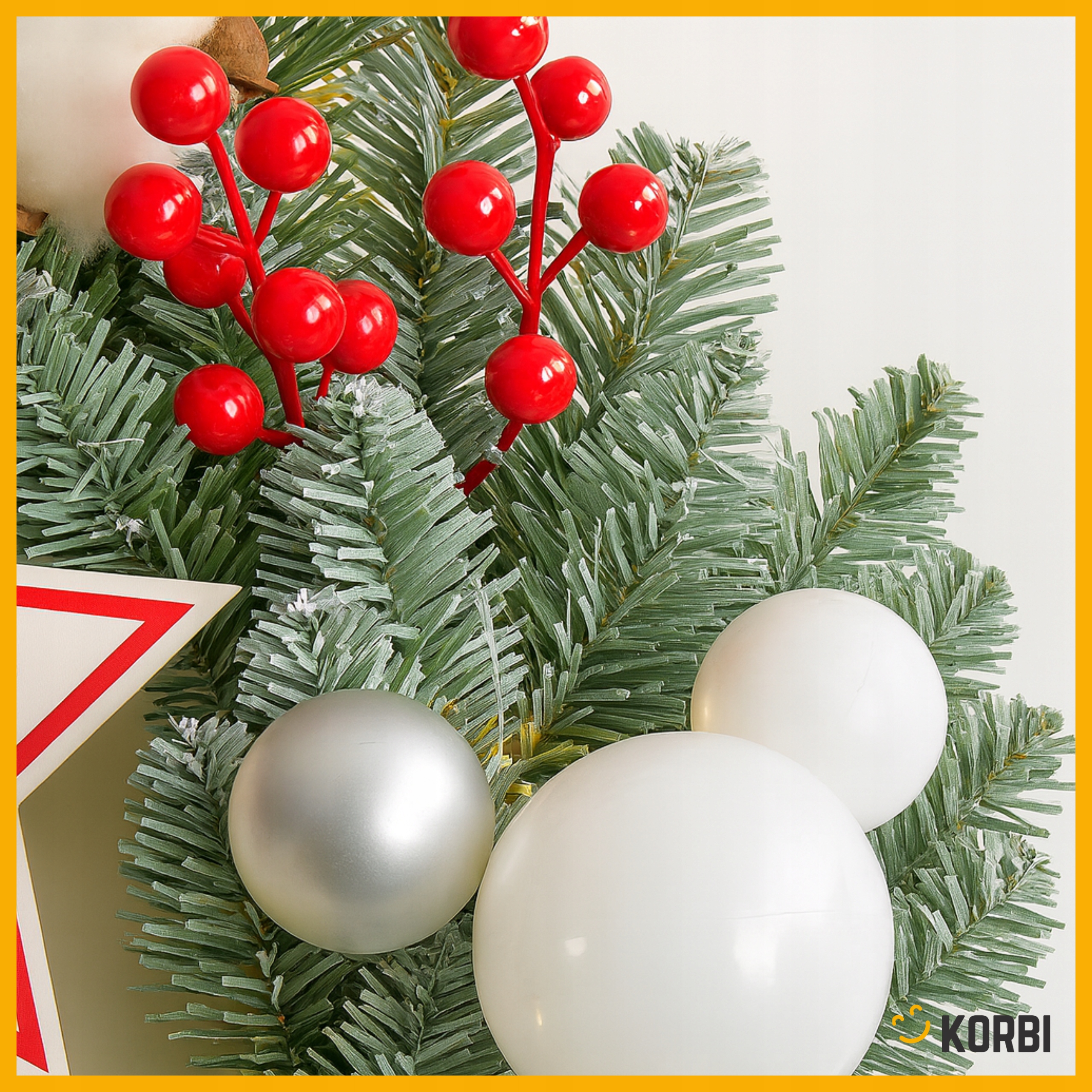 Ta čudovit božični venček je kvintesenca prazničnega vzdušja. Z združitvijo zelenih iglic, belih in srebrnih kroglic, rdečih plodov, bombaža in cvetov božične zvezde dekoracija očara s svojo bogato podrobnostjo in naravnim videzom. To okrasje pritegne pogled in poudari poseben značaj božičnega časa.