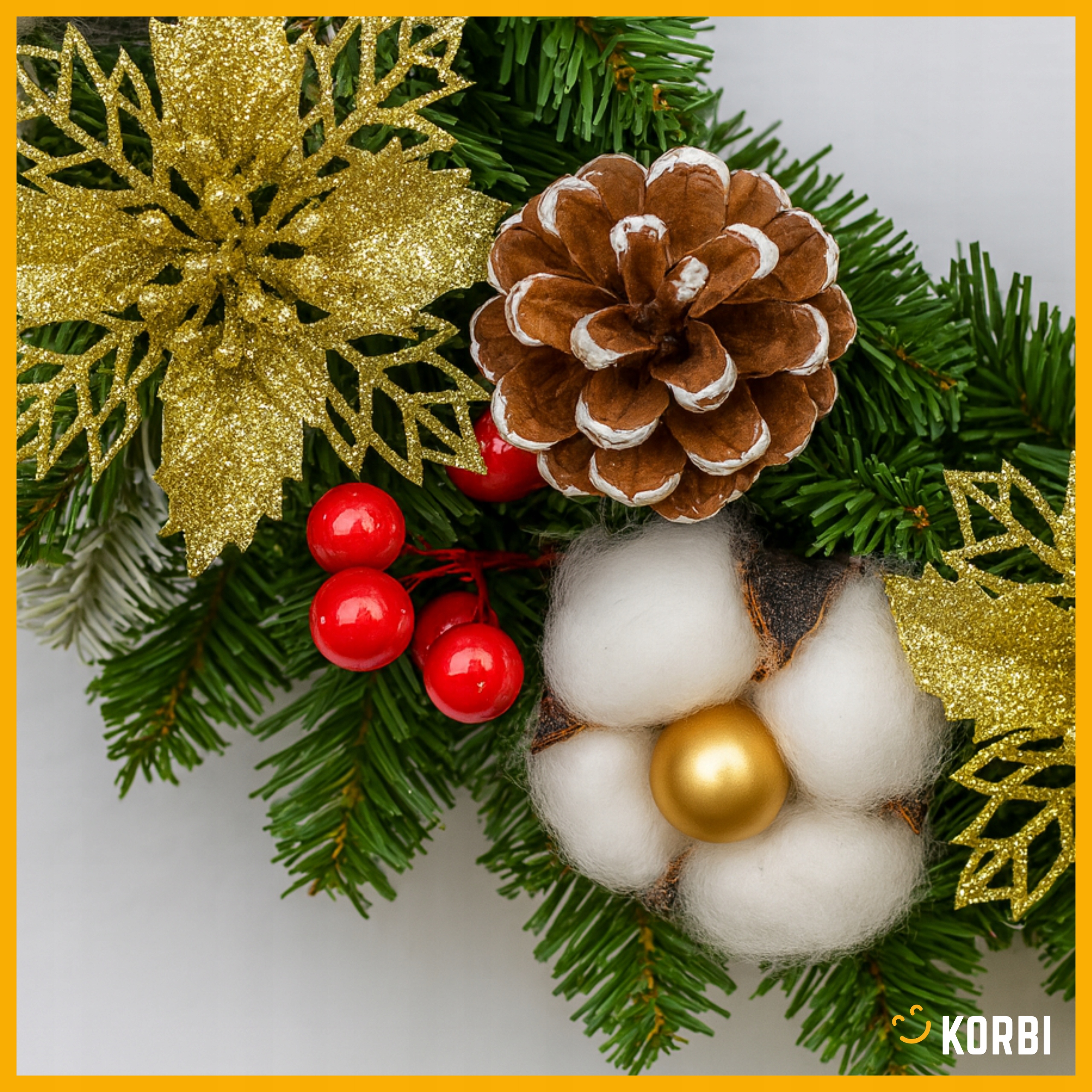 Ta čudovit božični venček je kvintesenca prazničnega vzdušja. Z združitvijo zelenih iglic, plodov bombaža, storžev, rdečih plodov vrtne borovnice in cvetov božične zvezde dekoracija očara s svojo bogato podrobnostjo in naravnim videzom. To okrasje pritegne pogled in poudari poseben značaj božičnega časa.