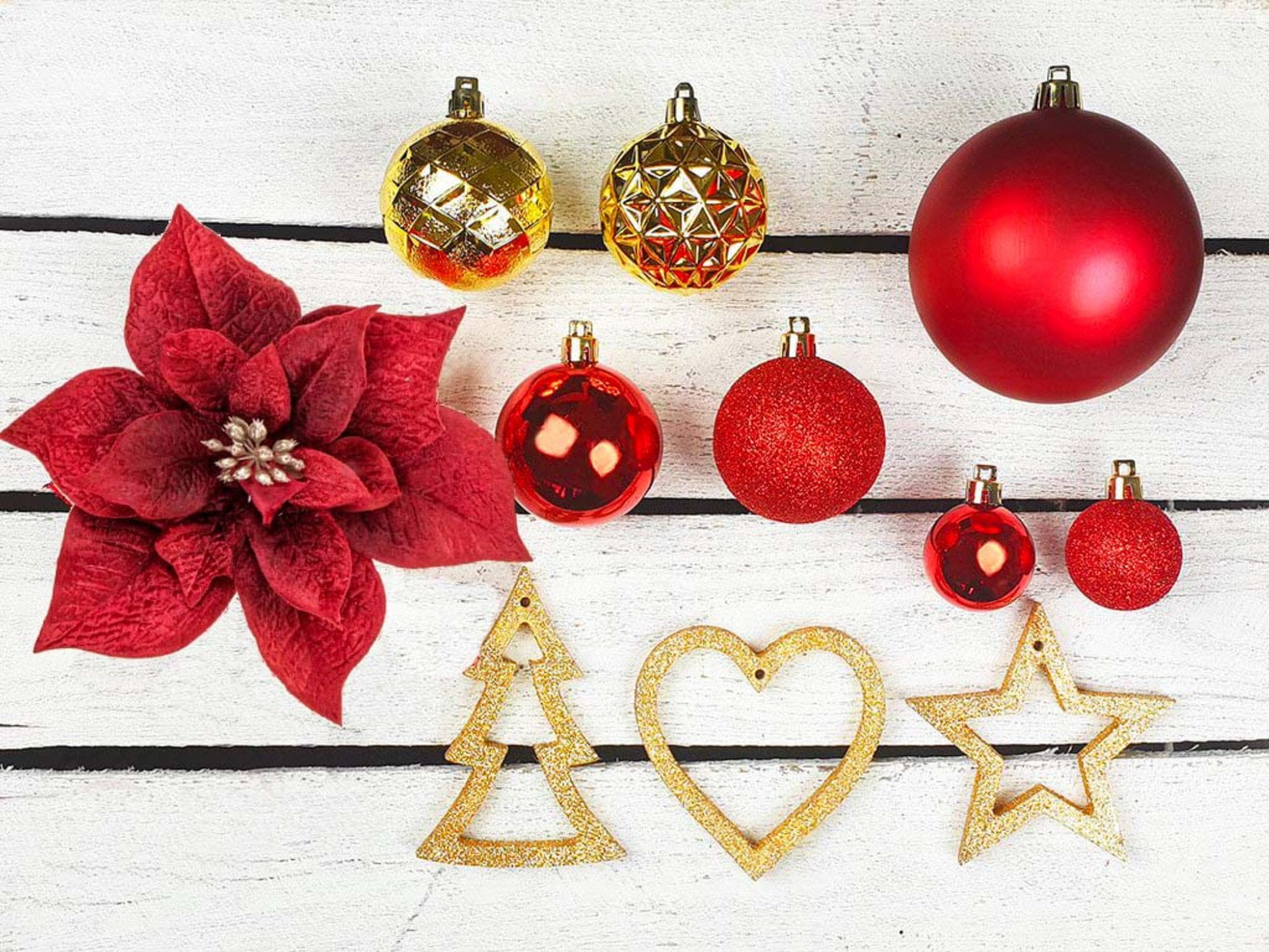 Rdeči in zlati božični okraski so tradicionalni simboli božiča in ta komplet okraskov to ponazarja.