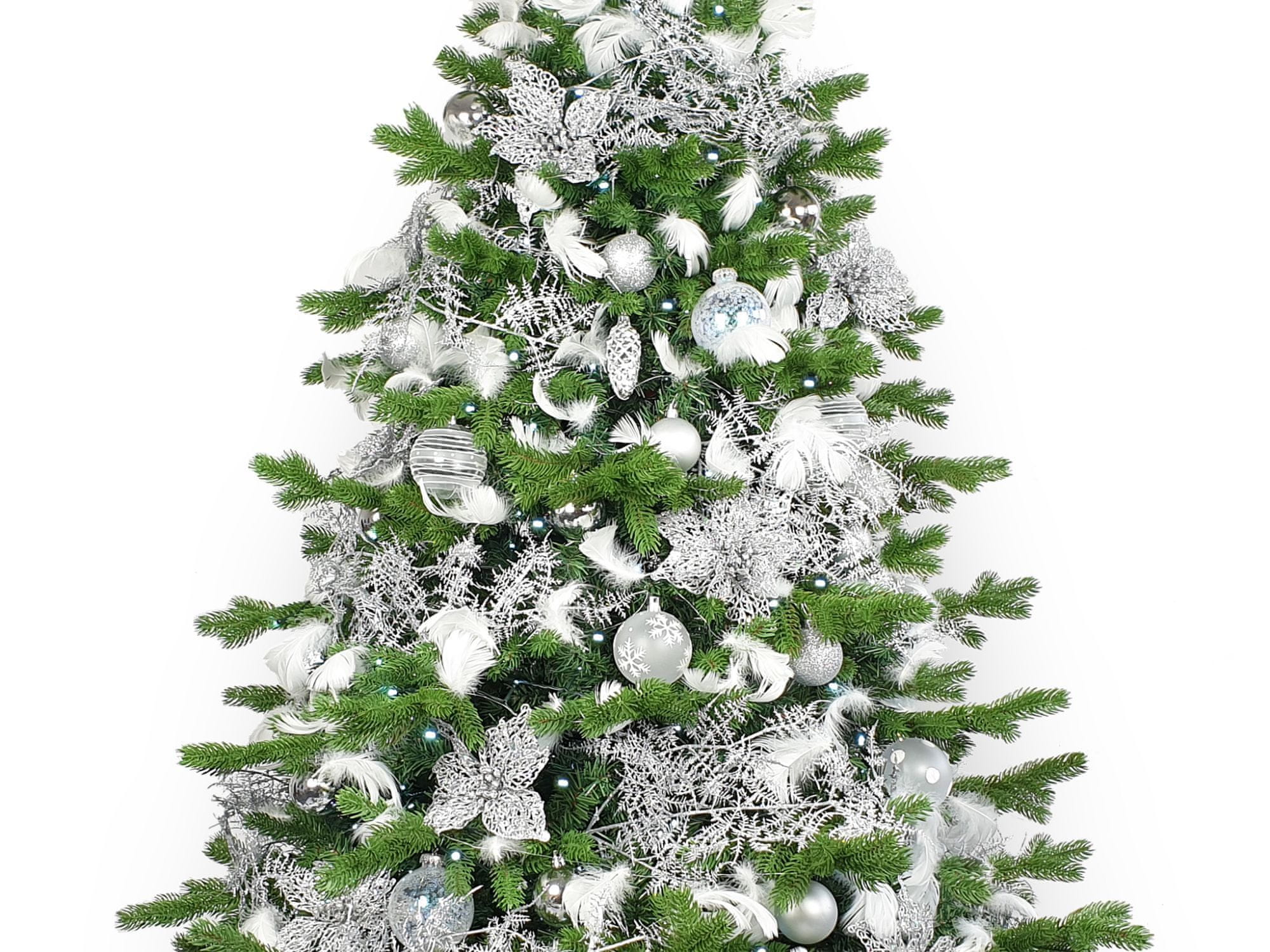 Bela peresa in srebrni trak za vrh drevesca dodajo lahkotnost in brezčasnost.