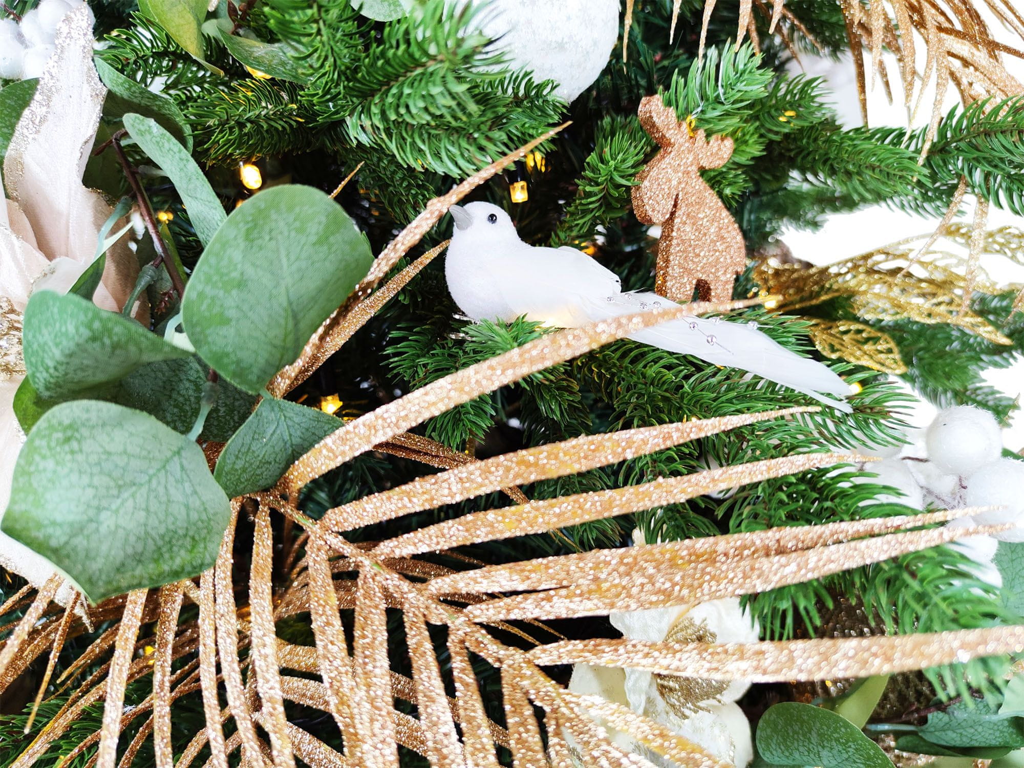 Okrasni listi v odtenkih šampanjca skupaj z belo in zeleno barvo dajejo drevesu sodoben in razkošen videz.