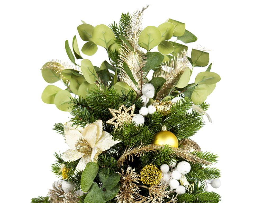 Na vrhu je šopek evkaliptusovih listov v kombinaciji z zlatimi vejami.