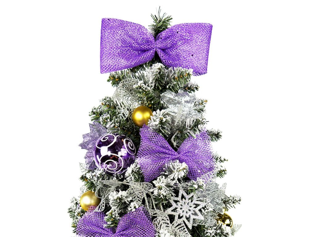 Ta stilski komplet okraskov združuje vijolične pentlje, srebrne okraske in zlate okrogle okraske.