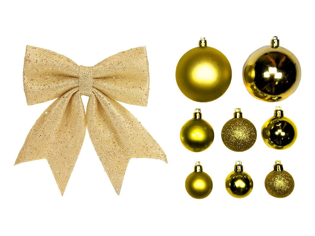 Vključuje mešanico zlatih okraskov velikosti od 4 do 15 cm ter masivno pentljo iz blaga z bleščicami, ki je kot nalašč za okrasitev vrha drevesa.