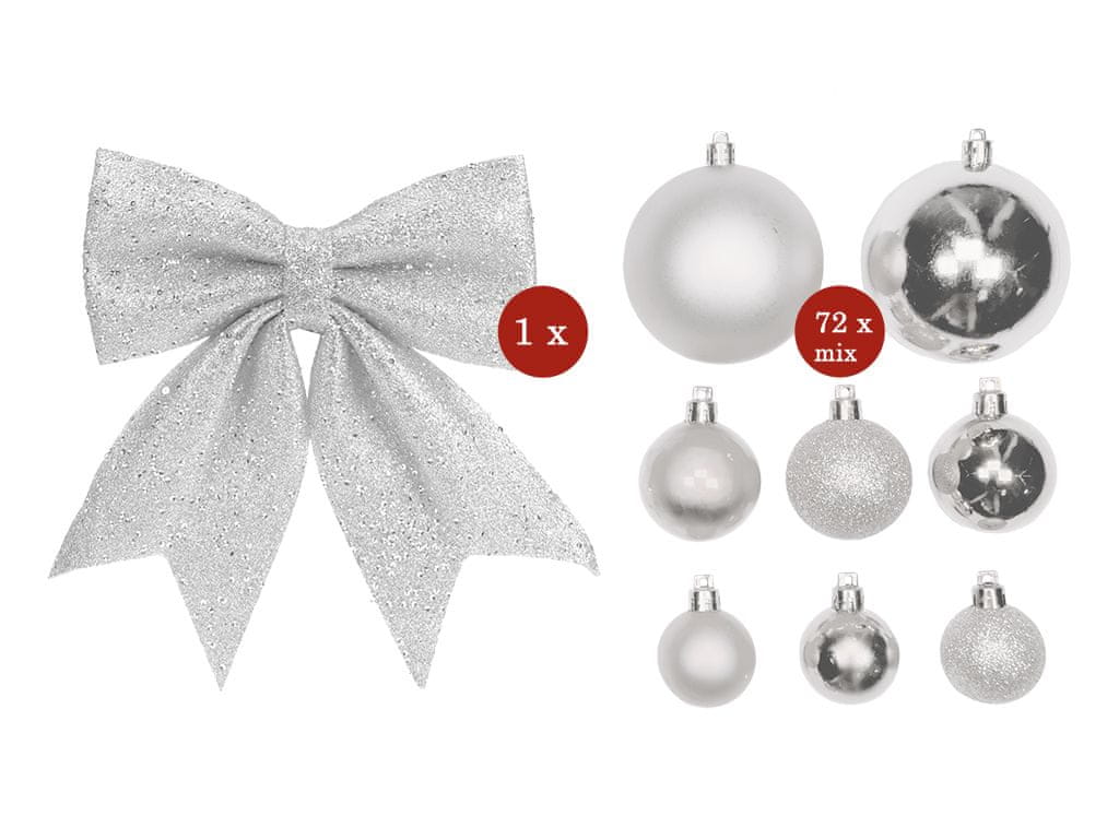 Vključuje mešanico srebrnih okraskov velikosti od 4 do 15 cm ter masivno pentljo iz blaga z bleščicami, ki je kot nalašč za okrasitev vrha drevesa.