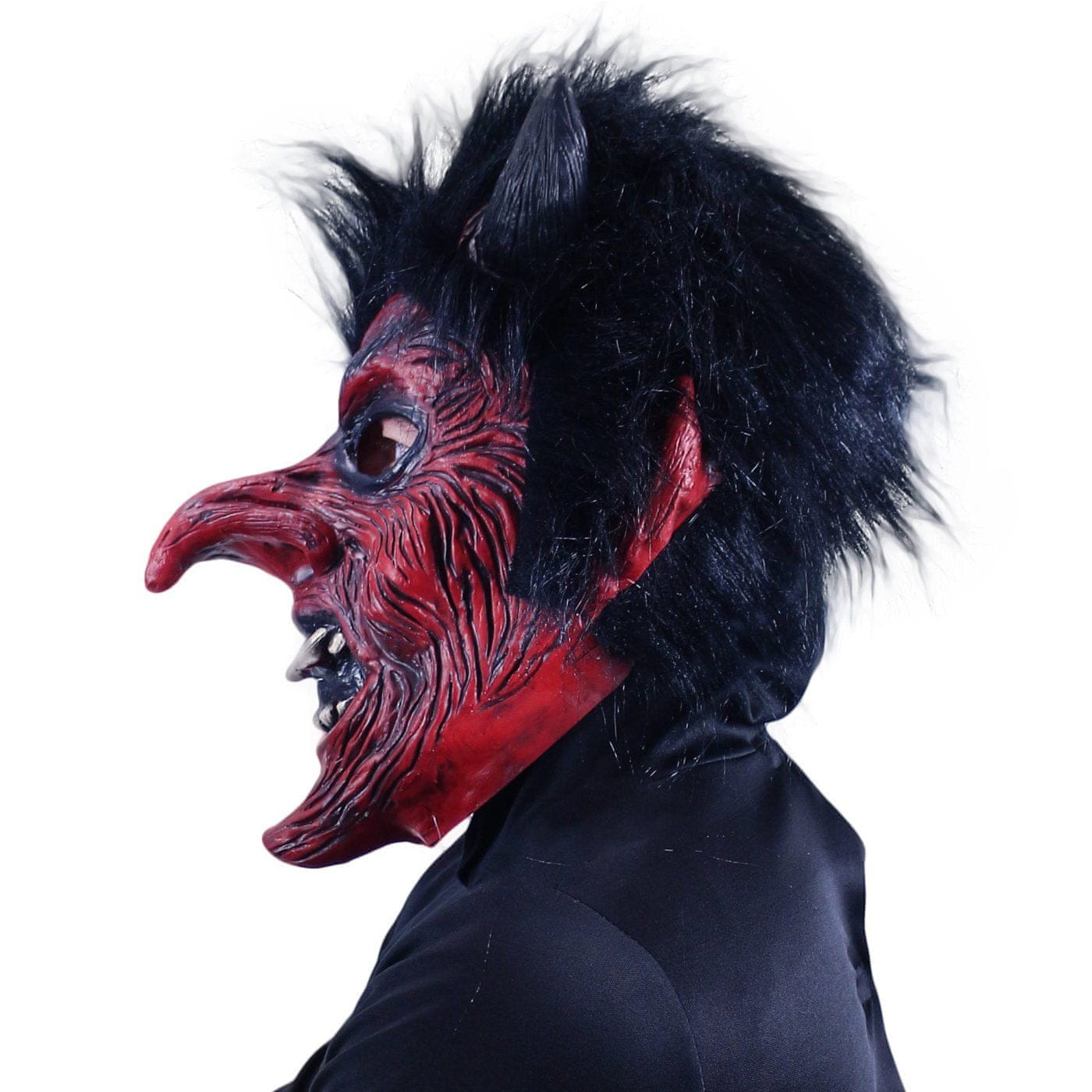 Senzacionalna maska hudiča je odličen dodatek kostumu. Lateksna strašljiva maska je rdeče barve s črnimi lasmi. S to strašljivo masko prestrašite svoje prijatelje in se zabavajte.