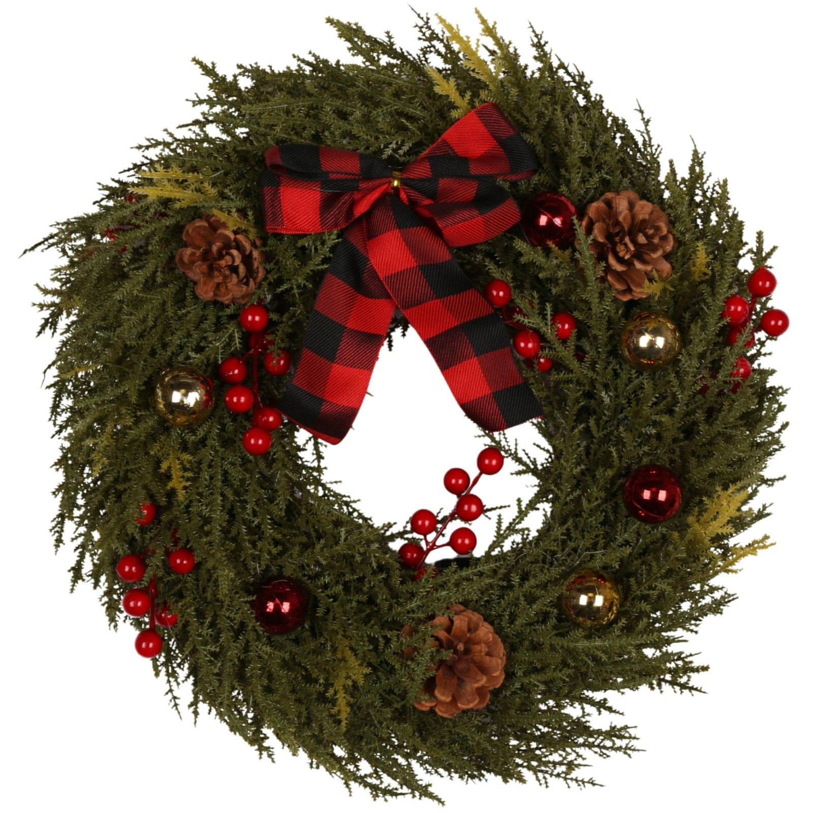 Zelene veje, rdeči plodovi, storži in šahovnica mu dajejo klasičen božični videz.