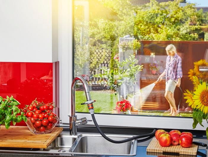 GARDENA inomhuskranadapter gör slut på tunga, fulla vattenkannor. Anslut bara adaptern till en vattenkran, till exempel i köket eller badrummet. Nu kan du ansluta en trädgårdsslang och låta den rinna direkt till blommor och andra växter (eller till ett duschkar!) på din balkong, terrass eller veranda. Installationen är snabb och enkel. Inga verktyg behövs förutom den medföljande nyckeln. När du har fäst den gängade adaptern på kranen, skjut bara krankopplingen över den. Tryck på den orange sidan av spärren för att låsa kopplingen och anslut slangen. För att öppna, tryck på den grå sidan av spärren. Det ursprungliga GARDENA-systemet ger inte bara en stabil och tät anslutning, utan låter dig även ansluta valfritt sprutmunstycke till slangen. Adaptern passar alla standardkranar med en M 24 × 1 invändig gänga och en M 22 × 1 utvändig gänga (ej lämplig för trycklösa och lågtrycksvattenberedare).