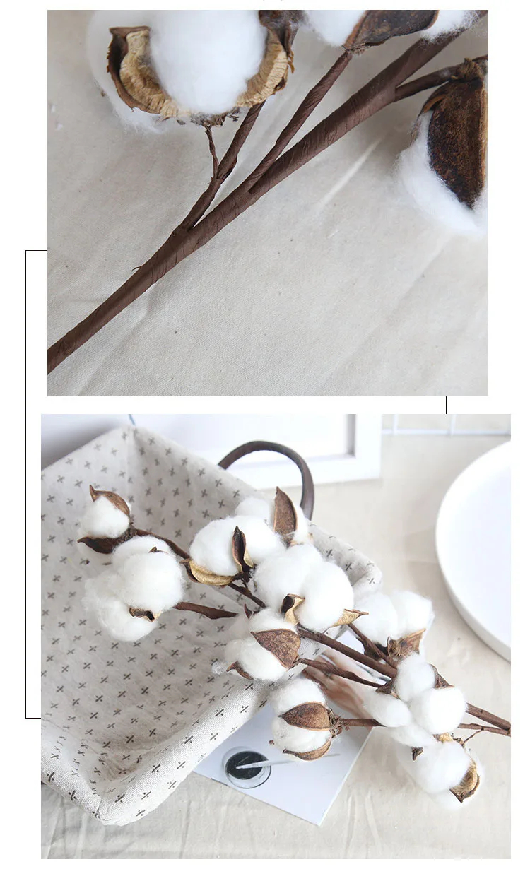 S to čudovito umetno vejo bombaža vnesite pastoralno vzdušje podeželske pokrajine v svoj dom. Nežno izdelane, puhaste bombažne kroglice, nameščene na realističnih steblih, prinašajo v vaš dom naravni mir in harmonijo. Ta dekorativna veja ponuja vzdržljivost in lepoto brez potrebe po vzdrževanju ter je odlična za vse, ki želijo v svojo notranjost dodati pridih narave.