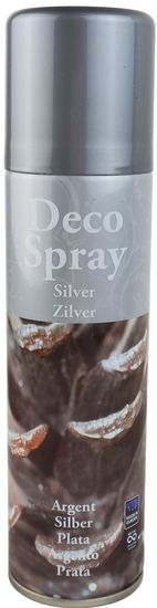 Srebrni sprej je primeren za okrasitev predvsem božičnih predmetov: izložb, omele, listov, božičnih drevesc itd. Uporaba: segrejte na sobno temperaturo, temeljito pretresite in nato z razdalje 30–40 cm nanesite na okrašen predmet. Ko končate, obrnite posodo navzdol in popršite ventil, da preprečite lepljenje. Razpršilo lahko odstranite z acetonskim razredčilom. Ne uporabljajte na plastiki, pobarvanih predmetih ali pohištvu. Pakiranje: 150 ml.