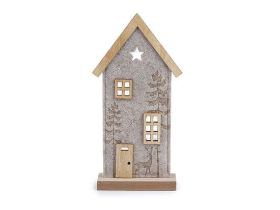 Dekorativna hišica ima osnovo iz trdne klobučevine ter streho, osnovo in detajle iz lesa. Sprednja stran je okrašena z gozdnim motivom z izrezi jelenov in zvezd. Z njo bo vsaka notranjost postala prijetna. Hiška je idealna za različne sezonske in praznične sezone, še posebej kot elegantna božična dekoracija. Postavite jo lahko na ognjišče, okensko polico, polico ali pa bo izstopala kot del večje dekorativne kompozicije na mizi.
