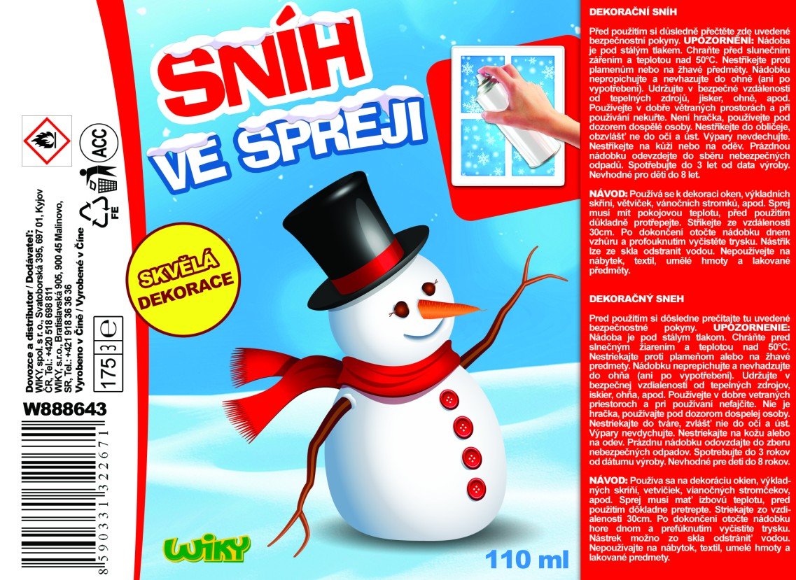 Snežni sprej pomaga ustvariti čarobno božično vzdušje. Uporablja se za okraševanje oken, izložb, ogledal in vej božičnega drevesa. Sprej mora biti na sobni temperaturi. Pred uporabo ga pretresite in razpršite z razdalje 30 cm. Ne uporabljajte na pohištvu, tekstilu, plastiki in pobarvanih površinah. Prostornina razpršila je 110 ml. Velikost razpršila: 17 cm Ni igrača